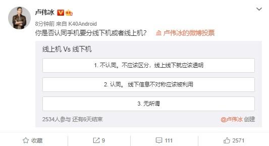 近日,小米集团副总裁,中国区总裁,红米 Redmi 品牌总经理 @卢伟冰今日发布投票调查,询问网友对于手机分线上和线下两种版本的看法。