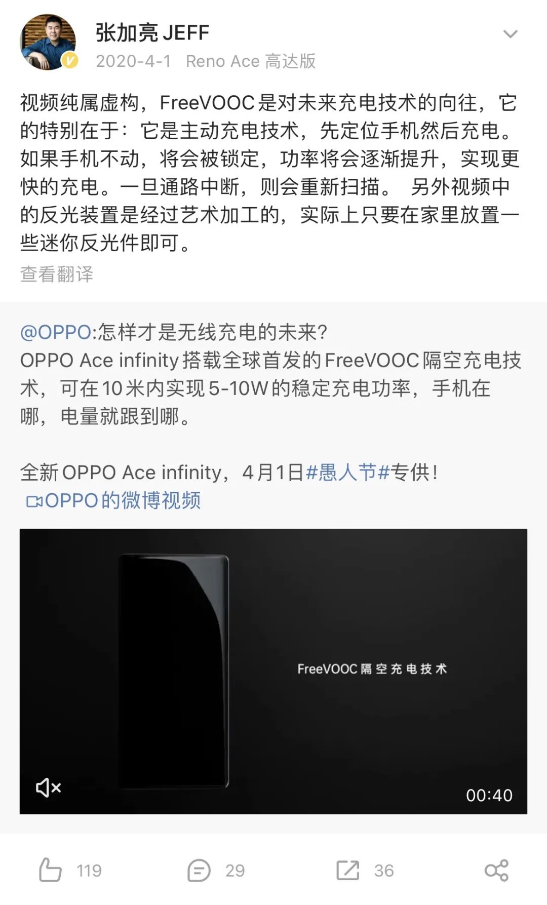 手机厂商也明显对激光充电更感兴趣:2020 年 4 月 1 日愚人节,OPPO 公布了名为“FreeVooc”隔空充电概念视频,虽然只是恶搞,但 VOOC 首席工程师张加亮的回应却耐人寻味。