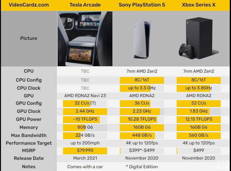 此外这套系统还提供 HDMI 1.4 和双 DP 接口以连接车载大屏,并提供 PCIE Gen4 x8(8Gb/s)的通道。 特斯拉这套车载系统的性能主频可达 2.44GHz,算力为 10 TFLOPS,这一水平相比索尼 PS5/微软 Xbox X 等游戏主机。
