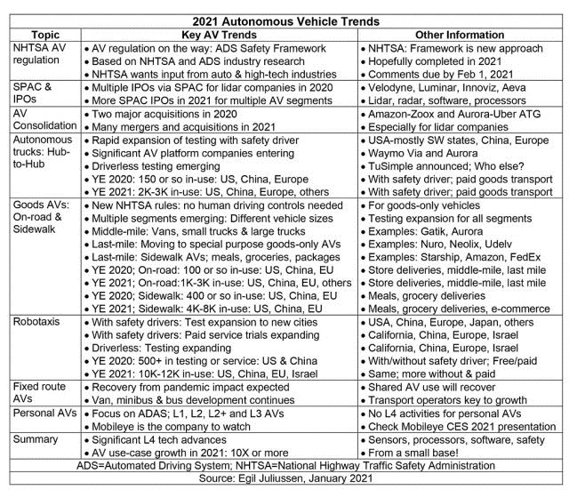 下表是对2021年和2020年主要自动驾驶趋势的概述。