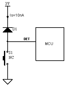 图6是一种超低功耗设备的入侵检测电路。常闭开关S1用于入侵检测,设备外壳被破坏时开关S1断开。该电路中二极管D1用作超低电流的上拉元件,其反向漏电流Is约为10nA。一旦外壳被破坏,S1断开,D1将控制器MCU的管脚DET拉高,产生上升沿作为入侵触发信号。这个电路的主要测试项目有二极管反向漏电流Is,开关S1闭合时的DET电平,开关S1断开时的DET电平,开关S1闭合到断开过程中DET管脚的电压上升沿波形。