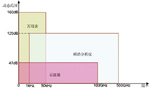 假定黑盒内部的电路和信号输入均正常,如果黑盒的输出仍然有问题,这时就应该重点排查电源输入。常用的电源检测仪器有示波器、频谱仪和数字万用表,它们能够覆盖的测量范围不同(如图2所示),应该综合运用这些仪器来全面观察电源信号,避免测试盲区。
