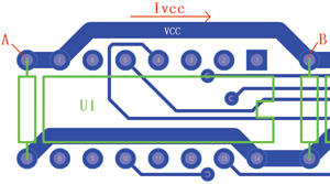 如图8所示,需要测量芯片U1的VCC电流Ivcc,其电流方向是从A点到B点。可以先断开电路的电源,然后使用DM3068的电阻测量功能测量AB两点间的PCB导线电阻,接着接通电源并测量AB两点之间的电压,最后用测得的电压除以测得的电阻即可得到电流的大小。例如,PCB导线电阻为4.8mΩ(1oz厚,20mm长,2mm宽的导线),测得电压为48μV,则电流大小为10mA。