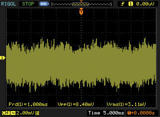 图3是用示波器测得的某个模数混合电路的模拟部分电源电压波形,由于示波器的带宽很大,波形中大部分是数字电路引入的宽带开关噪声,幅度为8.4mVpp。一般情况下,8.4mVpp电源纹波和噪声符合人们的“心理期望”,因而就认为电源没有问题(电源影响被低估)。