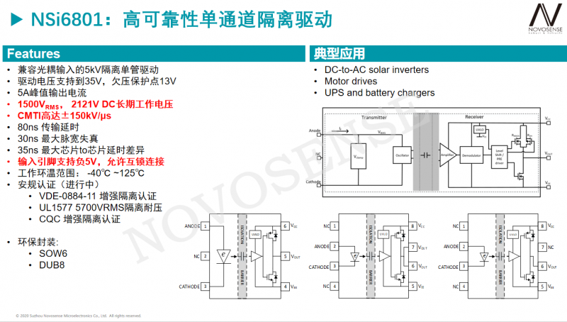 通过多项对比可以发现,无论是共模抑制能力、隔离性能、工作寿命、传输延时,还是驱动能力与温升,NSi6801都比对应的主流光耦隔离驱动有明显优势,而又由于其管脚兼容,工程师无须改动设计就可以应用,可一步到位提高设计性能,所以NSi6801是替代光耦隔离驱动的更优选择。