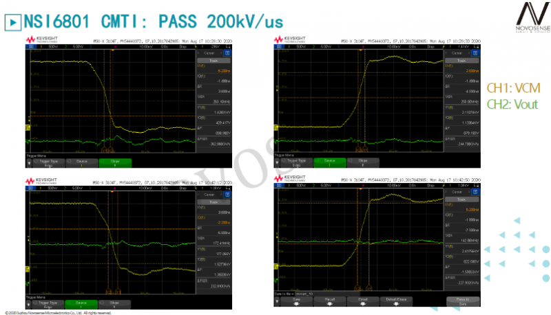 以共模干扰抑制能力(CMTI)为例,由于光耦隔离器件的寄生电容效应,干扰脉冲可能会导致输出端出现误关断或误开通的动作。某款主流光耦隔离驱动Axx-Wxxx在输入端出现35kV/μs的脉冲信号时,输出端就会误触发。NSi6801采用电容隔离,为提高共模抑制能力,NSi6801的隔离电路由四个电容组成差分线路传递信号,通过设计保证这四个电容的容值接近,从而有效降低共模干扰,同时,纳芯微独家专利的“Adaptive OOK™技术”,也进一步增强了抗共模干扰的能力。在实测中,NSi6801 在200kV/μs的共模干扰下仍可保持输出端的正确状态。