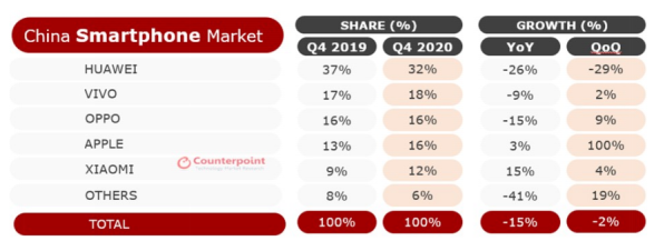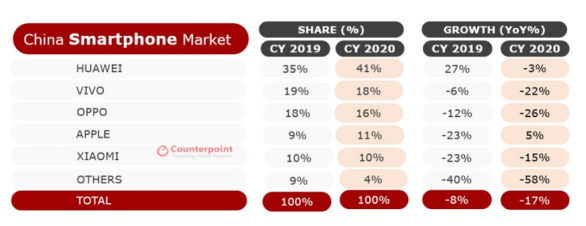 2021年02月02日 | Counterpoint:2020年中国手机市场同比下降17%,苹果增长