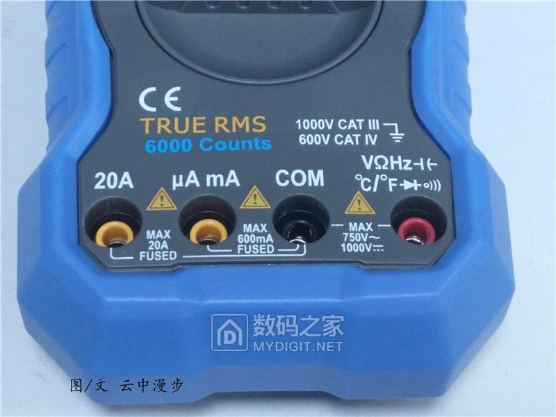 最下方的接线柱红黑黄颜色非常的显眼,在相应的位置同样印刷有不同档位说明。显眼位置印有TRUE RMS:具备真有效值量测功能,这可是高端万用表才具有的特点。6000 counts:说明这个表头最大可以显示5999这个数字,也就是5/6位万用表,这个参数也表示了万用表的显示精度。