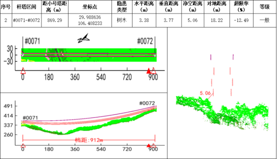 电力线巡检主要是发现植被、房屋、电力线等不符合《架空输电线路运行规程》规范要求的物体的位置及属性。将蜂鸟获取的点云数据导入电力分析软件,可以快速分析得到实施工况报告、交跨报告。