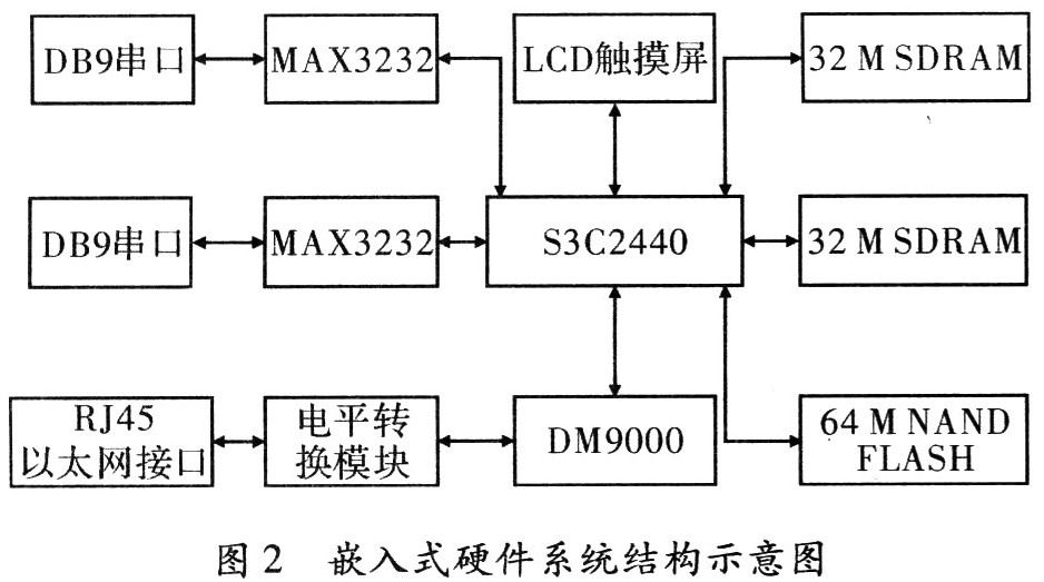 ARM系统硬件部分采用三星公司的ARM芯片S3C2440,S3C2440基于32 bit ARM920T内核,标称工作频率为400 MHz,配置一片64 MBytes Nand Flash和两片32 MBtyes SDRAM,网络芯片采用DM9000A,配置了MAX3232扩展串口与电子负载进行连接。结构图,如图2所示。