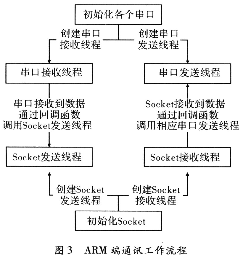 修改注册表使ARM系统上电后自动运行通讯软件:首先进行串口和以太网的初始化,对每个串口创建单独的接收线程和发送线程,Socket监听到上位机连接后,创建与上位机连接的数据收发线程。当串口的接收线程接收到数据时,触发相应的回调函数,调用Socket的发送线程把数据发送给上位机。当上位机发送数据给ARM服务器时,Socket的接收线程触发相应的回调函数,根据帧中负载地址,调用对应的串口发送线程向指定的目标负载转发数据。工作流程,如图3所示。