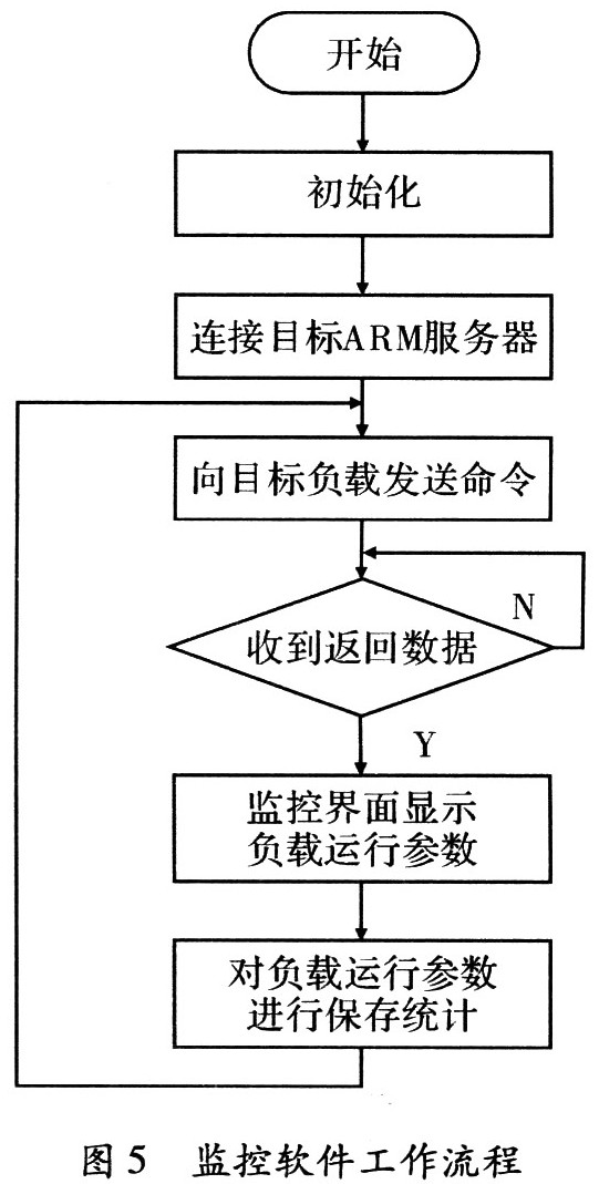 上位机在初始化过程中按照设置的IP地址和端口范围对网络进行扫描,得到网络中ARM服务器的运行状态,将可用ARM服务器IP地址和端口返回。用户选择可用的目标ARM服务器完成负载监控系统的网络连接,实现上位机对负载的监控。上位机监控软件按照设定时间间隔向目标负载发送控制命令,如状态参数查询命令,负载接收到命令后发送返回数据,监控软件根据返回数据得到负载当前运行状态信息。