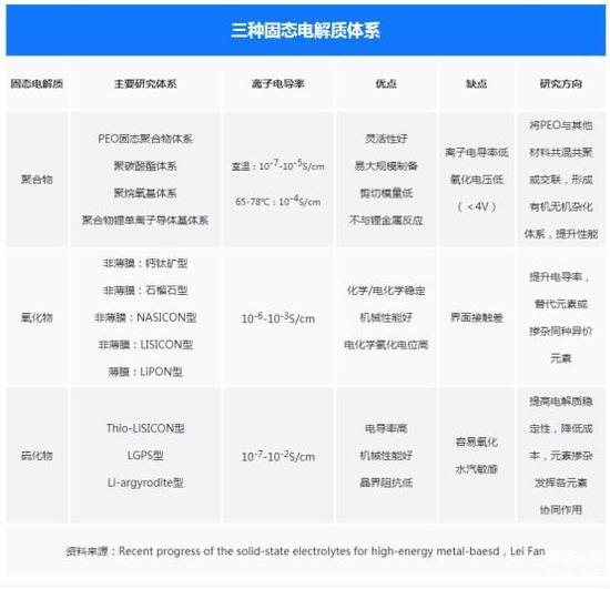 氧化物电解质的优势是稳定性好,循环寿命长(可达1000次以上),能量密度较高,倍率性能较好,同时成本较低;主要缺陷是界面接触问题尚未完美解决。相比之下,硫化物电解质工业化较难,与电极接触时的界面阻抗普遍较高;聚合物电池在移动电源市场上已经做到了量产,但是充电倍率较差,能量密度较低。从聚合物技术路线看,与硫系及氧化物相比,聚合物技术路线不占优势,但是在集成方面,聚合物技术路线还是有一些优势的。总体来看,氧化物固态电池是综合前景最好的。