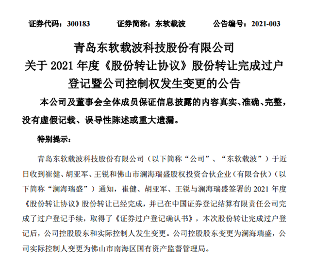 2月3日晚间,东软载波发布公告称,东软载波于近日收到崔健、胡亚军、王锐和佛山市澜海瑞盛股权投资合伙企业(有限合伙)(以下简称“澜海瑞盛”)通知, 崔健、胡亚军、王锐与澜海瑞盛签署的2021年度《股份转让协议》股份转让已经完成,并已在中国证券登记结算有限责任公司完成了过户登记手续,取得了《证券过户登记确认书》,本次股份转让完成过户登记后,东软载波控股股东和实际控制人发生变更。东软载波控股股东变更为澜海瑞盛,东软载波实际控制人变更为佛山市南海区国有资产监督管理局。