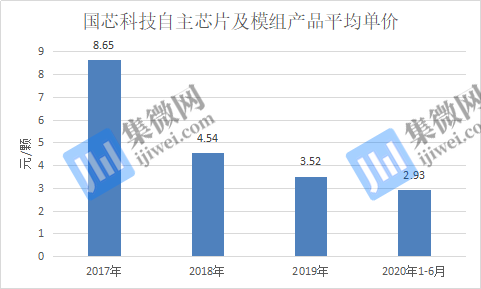 2017年至2020年1-6月,国芯科技自主芯片及模组产品实现的收入分别为6,064.25万元、6,029.42万元、9,419.88万元和3,575.29万元。尽管其营收规模实现上涨,但在产品平均单价下滑的背景下,其毛利率也逐年下降。