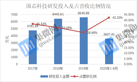 2017-2020年上半年,国芯科技研发投入金额分别为4781.69万元、6445.81万元、6640.89万元、3607.43万元,占营业收入比例分别为36.53%、33.09%、28.68%、42.20%。报告期内,国芯科技累计研发投入2.15亿元,占营业收入的比重为33.41%。