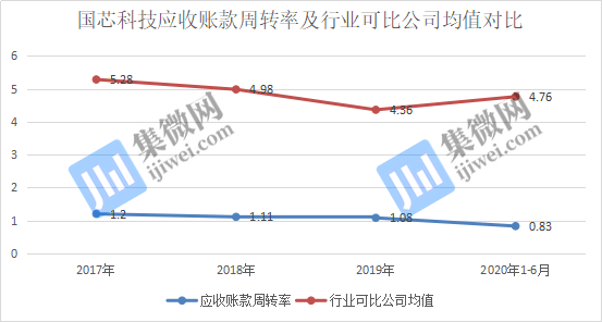而其应收账款周转率分别为1.20、1.11、1.08、0.83,行业可比公司均值为5.28、4.98、4.36、4.76,均高于国芯科技。