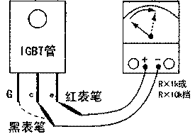 用MF500型万用表R&TImes;10k挡,红表笔接e极,黑表笔接c极时,阻值为无穷大;若这时用手指同时接触一下黑表笔与G极,阻值立即降至110kΩ;若用黑表笔触一下G极,再次测得c、e极间正向电阻已降为16kΩ左右。