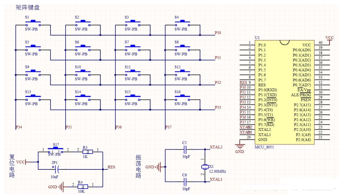 矩阵键盘与8051连接如上图所示,首先,令P3=0x0f,检测P30、P31、P32、P33哪一行被按下,将此时P3的值存入寄存器1。然后,令P3=0xf0 | 寄存器1,检测P34、P35、P36、P37哪一列被按下,将此时P3的值存入寄存器2。最后,把寄存器1的值和寄存器2的值组合起来即可得到矩阵键盘的编码。