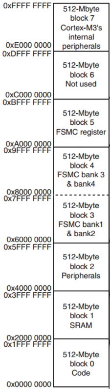 STM32 的存储器结构中 Flash,SRAM 寄存器和输入输出端口被组织在同一个 4GB 的线性地址空间内。