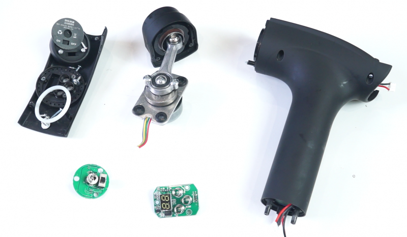 拆解完只剩带有电池的手柄;核心的无刷电机,带有驱动板;开关总电源跟充电小板;控制小板以及一堆渣渣。