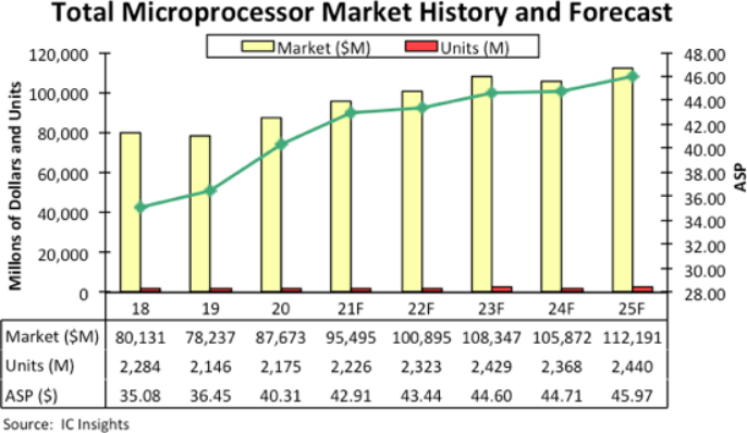 IC Insights最近发布了2021年版的《麦克林报告》(The McClean Report),对2020年整个微处理器(MPU)市场做了总结,并展望了未来五年的市场销售状况。