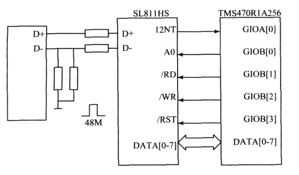 图4 SL811HS 与TMS470R1A256 的硬件连接