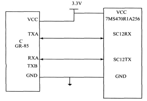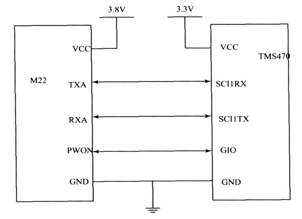 Benq M22 和上位机的通讯数据接口为UART ,电平为TTL/ CMOS , 波特率为标称的300~115200bp s 的自适应波特率,只要是这个区间的标称波特率,模块自动识别,无须用户去干预,可以接成全串口或者半串口通讯。所谓的全串口,是指DB9 的九条线都需要接上,所谓的半串口则只接RXD , TXD 和GND 就可以进行通讯了。本系统采用半双工模式,则模块的RXD 可以直接连接TMS470R1A256 的TXD ,模块的TXD 可以直接连接TMS470 R1A256 的RXD ,如图6 所示。