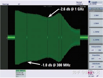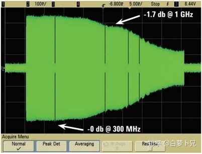 在示波器的 1 GHz 带宽中,大约有三分之一的部分几乎没有衰减(0 dB)。但是,并非所有示波器均表现出此类响应。