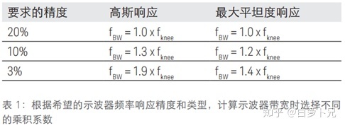 根据在测量上升时间和下降时间时希望达到的精度,确定测量信号所需要的示波器带宽。表 1 列出了决定示波器(具有高斯频率响应或最大平坦度频率响应)测量精度的多个乘积系数。