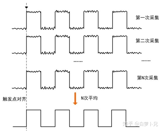 原理:示波器会对采集的N段波形,将它们按照触发位置对齐,对N段波形进行平均运算,最终得到一段平均后的波形。具体原理图如上图所示