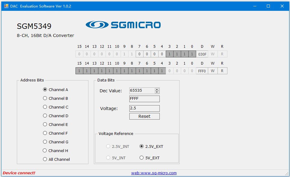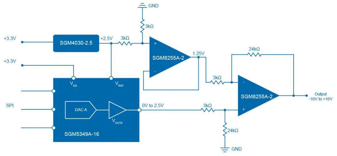 以上电路使用圣邦SGM5349A-16输出0V至2.5V电压,外置参考使用圣邦的高精度20ppm电压基准源SGM4030-2.5,使用圣邦36V工艺,10μV输入失调电压的高精度运放SGM8255A-2来调理信号正负10V输出。运放供电正负15V,运放电路差分放大倍数为8倍,当SGM5349A-16输出为零时,差分运放输出为 (0V - 1.25V) × 8 = -10V,当SGM5349A-16满幅2.5V输出时,差分运放输出为 (2.5V - 1.25V) × 8 = 10V。