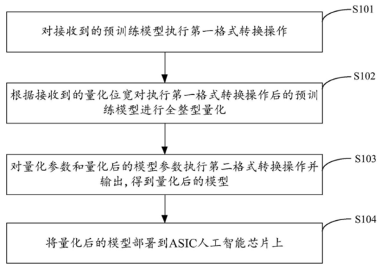 其次根据接收到的量化位宽对执行第一格式转换操作后的预训练模型进行全整型量化,得到量化参数和量化后的模型参数(S102)。虽然ASIC人工智能芯片功耗低、峰值计算性能较高,但通常内部具备较小的计算位宽,不同芯片的位宽略有不同,因此,量化位宽需要根据ASIC人工智能芯片的位宽确定。