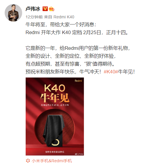 2021年02月09日 | 卢伟冰官宣Redmi K40定档,用全新设计