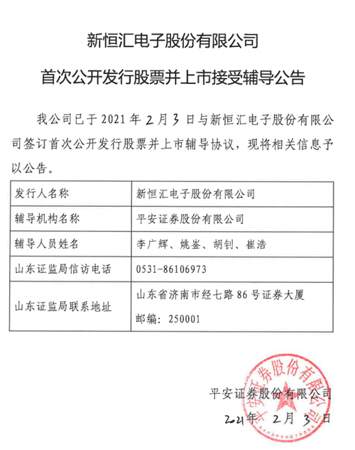 近日,山东监管局披露了新恒汇电子股份有限公司(以下简称“新恒汇电子”)首次公开发行股票并上市接受辅导的备案信息。据了解,新恒汇电子现已接受平安证券股份有限公司的辅导,并于2021年2月3日在山东证监局进行了辅导备案。