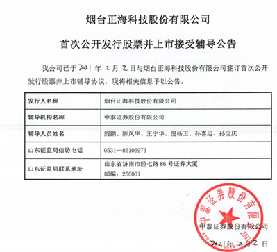 近日,山东证监局披露了烟台正海科技股份有限公司(以下简称“正海科技”)首次公开发行股票并上市接受辅导公告。公告显示,正海科技现已接受中泰证券股份有限公司的辅导,并于2021年2月2日在山东证监局进行了辅导备案。