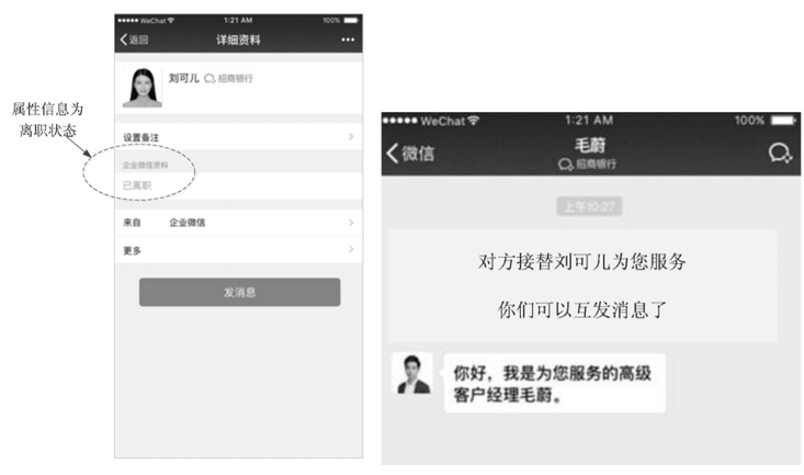 现在微信中有企业联系人,用户只需在企业联系人中查找该员工即可,非常方便。倘若该员工已经离职,则离职的企业员工无法再与用户进行沟通,同时用户可以查看该员工的详细资料,在资料中也可以看到该员工的属性信息为离职状态,如下图(左)所示: