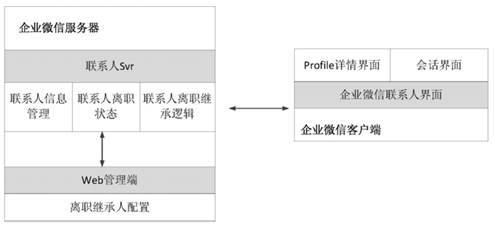 最后,我们来看看该专利中提供的企业微信的前端与后端通信的示意图,客户终端中的企业微信客户端的服务器与离职员工账号所属应用的服务器均为企业微信服务器。当员工离职时,管理员可以通过微信web管理端将离职人员的属性信息更改为离职状态,还可以在为该离职人员配置继承者。