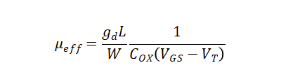 给定一个MOSFET的栅极长度L和器件宽度W,当漏极电压很小时(50毫伏),其漏极上的电流可以表示为一个关于迁移率的函数。根据栅极电感得到沟道内的载流子浓度,则可以得到器件沟道内的有效迁移率: