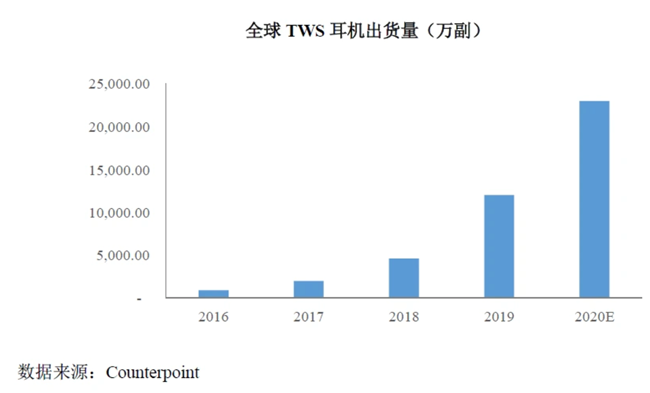 这个看上去不起眼的产品,时至今日竟然成为了苹果重要的收入来源,同时也把整个TWS耳机市场引爆。根据市场调研机构Counterpoint Research 的统计数据,2016 年TWS 耳机的全球出货量还只有918万副,2018 年就增长到了4600 万副,2020年预计将达到2.3 亿副。