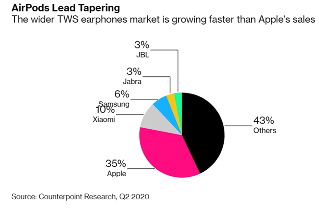 TWS耳机市场确实有追寻着智能手机市场的竞争格局轨迹一般,根据Counterpoint Research的报告,2018年四季度,苹果还占据着全球TWS耳机60%的市场份额;而到了2020年第二季度,虽然苹果的出货量仍在高速增长,但是市场份额已经下降到了35%。