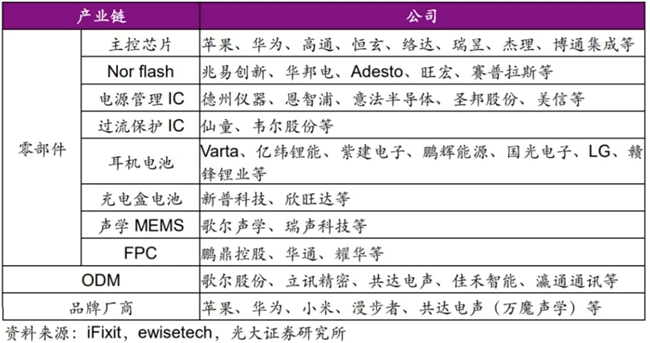 在火爆的TWS耳机市场的推动下,能为可穿戴市场提供多样发展的动力,而其背后也带动着庞大的元器件供应体系的成长。在目前较为成熟的产业链格局,上游个零组件厂商,中游ODM厂商,下游终端品牌厂商,都有不少企业已经成功上市。