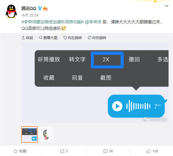 不过,腾讯QQ蹭了一波热度,其回应道:QQ的语音可以两倍速听。