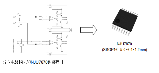 NJU7870采用了小型封装SSOP16,外接元件只需连接电源端子的电容器。与以往的分立电路构成相比,大幅度缩减了实装面积(比以往分立电路构成缩减90%:本公司调查结果)。