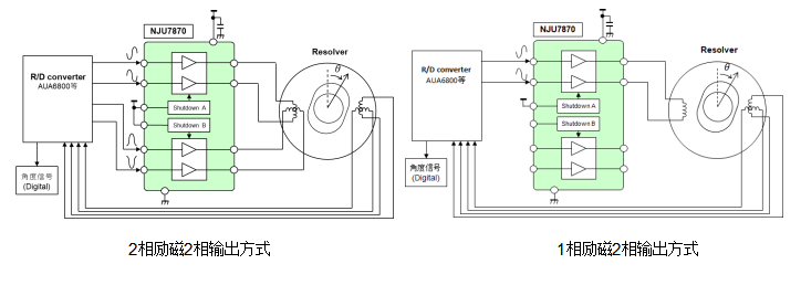 NJU7870搭载了2路差分电压输入和差分电流输出电路。可在外部控制各路工作,形成1相励磁或2相励磁方式,可和各种旋转变压器组合使用。另外,实现了在分立构成时难以做到的各相的高精度特性匹配,特别是2相励磁方式的旋转变压器系统,有助于电机旋转角度检测的高性能化。