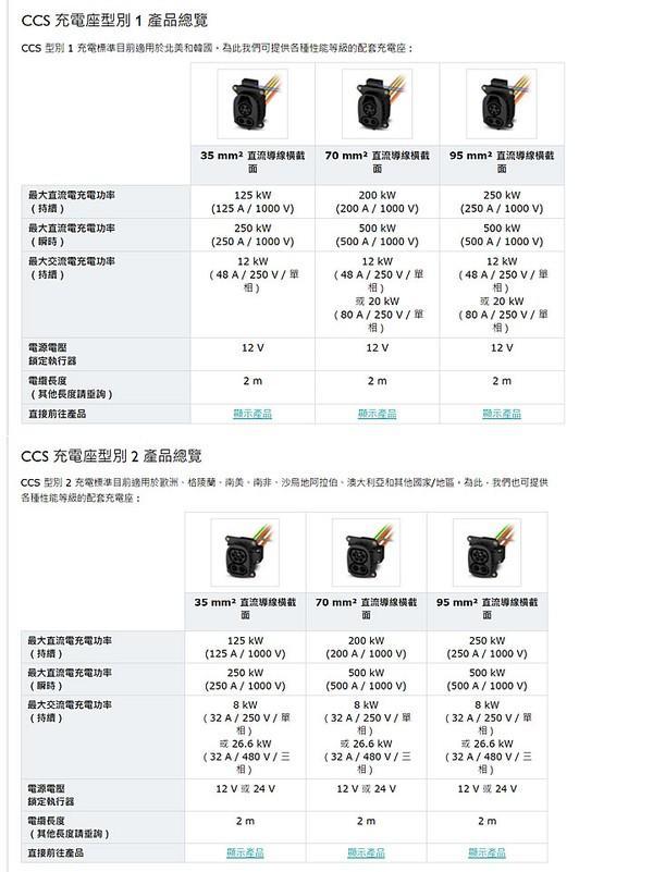 此次推出的 CCS 充电座分为对应美规 CCS 1 接孔、以及欧规 CCS 2 接孔,并各自拥有「35 mm² 直流导线横截面」、「70 mm² 直流导线横截面」、「95 mm² 直流导线横截面」3 种等级的充电座,未来车厂可各自依据车辆性能等级、而配备不同对应规格的充电座。