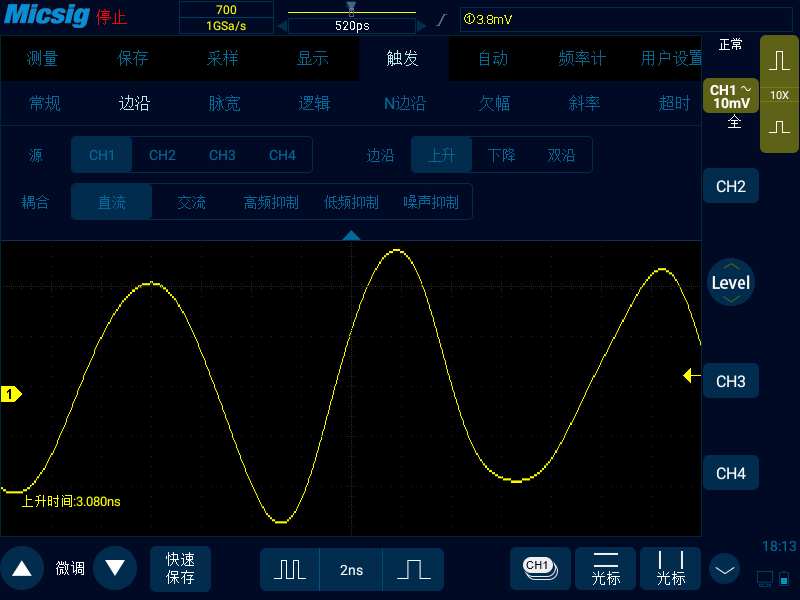 首先,我们用示波器的边沿触发将信号稳定。然后打开测量项测一下示波器的上升时间。