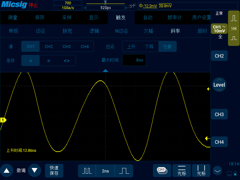 然后我们将示波器的触发方式改为斜率触发。斜率触发是指当波形从一个电平到达另一个电平的时间符合设定的时间条件时,产生触发。因此我们需要设置触发电平上限和触发电平下限。