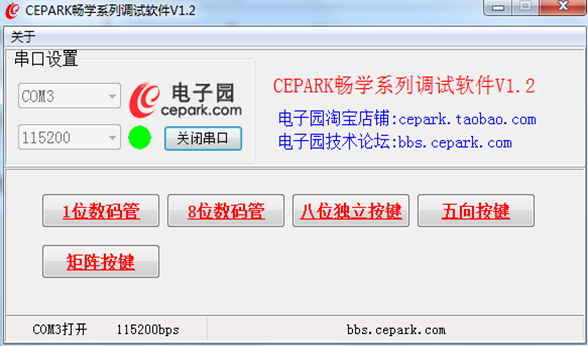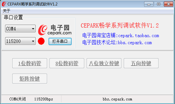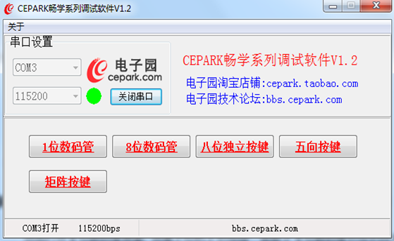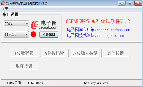 软件准备:CEPARK畅学系列调试软件V1.2 (使用本软件前请先关闭正在运行的串口)