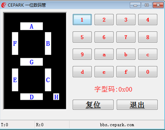 实验现象:点击选择上位机右侧对应数字或者字符,左侧显示对应数字或字符,同时底板1位数码管也显示对应数字或者字符。